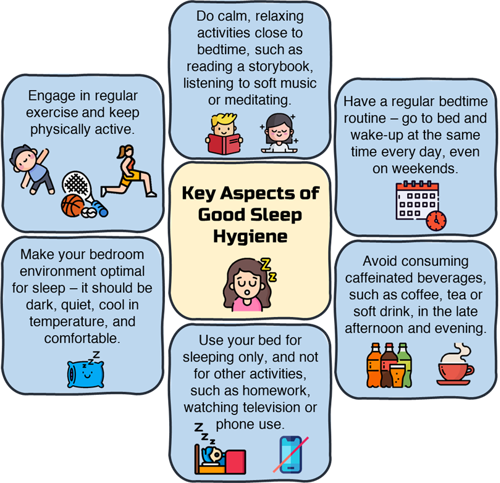 If your child has difficulty getting to sleep or staying asleep, there are certain behaviours they can engage in to help improve their sleeping patterns. This is known as sleep hygiene. The pictorial below shows the key behaviours involved with good sleep hygiene.