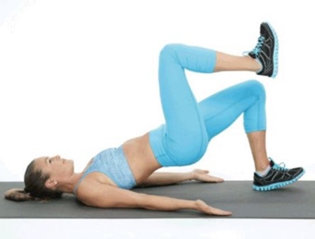 Start with your feet down and legs bent at 90 degree angles, then raise your hips up so that your body is in a straight line from your shoulders to your knees. Raise your foot up and point your knee towards the ceiling, and then repeat on the other side. Perform this 20 times.